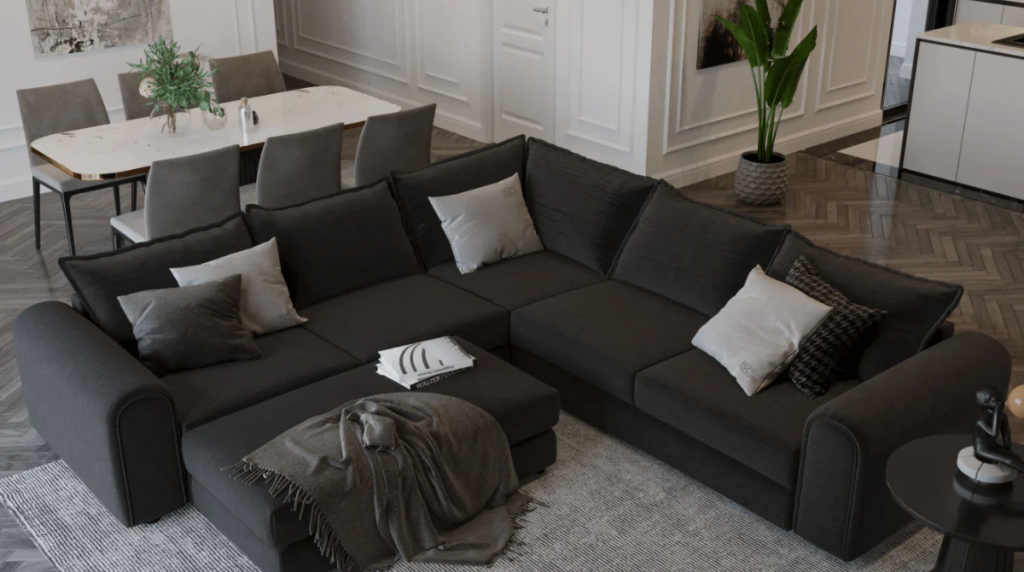 Untuk ruang yang lebih luas, misalnya 4×4 meter, sofa sectional (L atau U) lebih ideal. Sofa jenis ini memberi kapasitas duduk lebih banyak dan membangun focal point pada ruang keluarga.